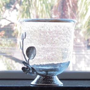 Home&co Patris Castiçal 17x16x16cm Vidro Transp O castiçal da linha Patris é feito de vidro com efeito martelado. A base e a borda são feitas de alumínio. Possui um lindo ramo de folhas feito de alumínio, soldado na base e estendendo até o centro do vidro. É uma linda peça que trará sofisticação ao ambiente. Ele vai deixar tudo mais bonito, convidativo e aconchegante.