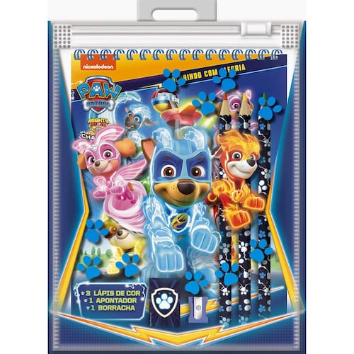 Colorir é muito mais divertido com a Patrulha Canina Colorindo com Alegria! O kit vem com 3 lápis de cor, um apontador, uma borracha e desenhos para colorir os filhotes mais corajosos da TV. É perfeito para soltar a imaginação e colorir com muita diversão!