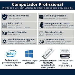 Computador completo intel i5 terceira geracao 8gb nvme 256 gb monitor led 20 w10 Computador com desempenho, preço justo e suporte de verdade - são mais de 30 anos de experiência em tecnologia, garantindo confiança e qualidade para você Equipamentos prontos para usar no dia a dia, com peças de qualidade, sistema instalado e de quem sabe o que faz. Ideal para quem busca um computador ágil e confiável, essa máquina foi pensada para lidar com várias tarefas ao mesmo tempo, sem travamentos ou perda de desempenho. Nossos diferenciais: 2. Montagem nacional com padrão Todos os nossos computadores são montados em ambiente industrial dentro do brasil, seguindo normas técnicas e rigoroso controle de qualidade. Isso garante um equipamento confiável, com suporte direto e entrega mais rápida. 3. Armazenamento m.2 nvme: velocidade de nova geração Este computador já vem com armazenamento no formato m.2 nvme, que é ainda mais rápido do que os ssds tradicionais. Essa tecnologia permite inicialização quase instantânea do sistema e abertura de programas em segundos, oferecendo uma experiência mais fluida e produtiva no uso diário. 4. Desempenho com processador intel Equipado com processador intel, reconhecido mundialmente por sua estabilidade e eficiência, esse computador oferece excelente desempenho para uso diário, multitarefas e aplicações profissionais. Você verá as especificações completas do processador mais abaixo na descrição. 5. Expansível e pronto para upgrades - sem perder a Quer adicionar uma placa de vídeo dedicada Ou instalar mais memória ou um novo hd Espaço interno e conexões disponíveis para você expandir quando quiser. Instale mais memória, hd ou placa de vídeo sem afetar a de fábrica. 6. de fábrica e suporte ao cliente Produto testado, revisado e enviado pronto para uso. Conta com completa e suporte técnico direto com a gente. . Em caso de dúvidas, estamos prontos para atender você com agilidade e clareza, garantindo uma experiência pós-venda segura e confiável. Especificações técnicas: Processador Marca: intel Série: i5 3 geração Frequência base: 3.10 ghz Frequência turbo max: 3.40ghz Núcleos: 4 Threads: 4 Placa mãe Micro atx Chipset: intel h series Slots de memórias: 2 Saídas de vídeo: hdmi e vga Saídas usb: 6 4 traseiras e 2 frontais Suporte nvme m.2: sim Conexões de áudio hd 6 canais: saída de áudio, entrada de áudio e microfone Conexão de rede: gigabit rj45 lan 10/100/1000 Memória ram Capacidade: 8gb Armazenamento Tipo: m.2 Capacidade: 256gb Gabinete Placa mãe suportada: micro atx Conexões: 2x usb e 2x áudio Cor: preto Baias: não possui Fonte Voltagem: bivolt Potência: 230w Sistema operacional Windows 10 pro vitalício Acessórios Monitor Teclado Mouse Caixa de som Monitor Especificações -tamanho da tela: 20 -formato de tela: 16:9 widescreen -resolução : 1600900 , hd+ 75hz -brilho: 300 cd/m2 -contraste: 1000:1 tipico -tempo de resposta: 5ms -suporte de cores: 16 milhões de cores - controle de ajuste digital -entrada: hdmi, vga -acompanha cabo hdmi -bivol -cor: preto -montagem da parede vesa: sim 12 meses Observações: - as imagens são meramente ilustrativas. - mudanças podem ocorrer no design do produto de acordo com o nosso momentâneo. Marca: Não Informado Ean: 7898888655664