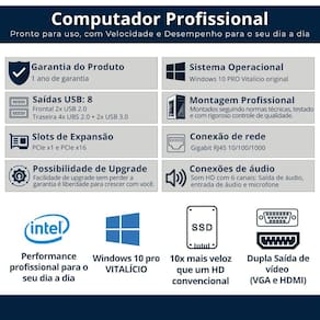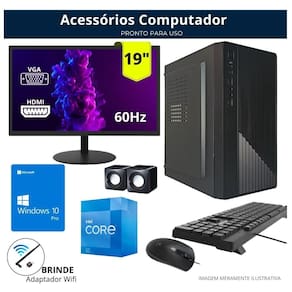 Computador Completo Intel Core I5 8gb Ssd 240 Gb Monitor Led 19 W10 Computador com desempenho, preço justo e suporte de verdade - são mais de 30 anos de experiência em tecnologia, garantindo confiança e qualidade para você Equipamentos prontos para usar no dia a dia, com peças de qualidade, sistema instalado e de quem sabe o que faz. Ideal para quem busca um computador ágil e confiável, essa máquina foi pensada para lidar com várias tarefas ao mesmo tempo, sem travamentos ou perda de desempenho. Nossos diferenciais: 2. Montagem nacional com padrão Todos os nossos computadores são montados em ambiente industrial dentro do Brasil, seguindo normas técnicas e rigoroso controle de qualidade. Isso garante um equipamento confiável, com suporte direto e entrega mais rápida. 3. Ssd: Velocidade que faz diferença Equipado com SSD, é até 10x mais rápido que um HD comum. Inicia o sistema e abre programas em poucos segundos. 4. Desempenho com Processador Intel Equipado com processador Intel, reconhecido mundialmente por sua estabilidade e eficiência, esse computador oferece excelente desempenho para uso diário, multitarefas e aplicações profissionais. Você verá as especificações completas do processador mais abaixo na descrição. 5. Expansível e pronto para upgrades - sem perder a Quer adicionar uma placa de vídeo dedicada Ou instalar mais memória ou um novo HD Espaço interno e conexões disponíveis para você expandir quando quiser. Instale mais memória, HD ou placa de vídeo sem afetar a de fábrica. 6. de fábrica e suporte ao cliente Produto testado, revisado e enviado pronto para uso. Conta com completa e suporte técnico direto com a gente. . Em caso de dúvidas, estamos prontos para atender você com agilidade e clareza, garantindo uma experiência pós-venda segura e confiável. Especificações técnicas: Processador Marca: Intel Série: I5 3 Geração Frequência base: 3.10 Ghz Frequência Turbo Max: 3.40ghz Núcleos: 4 Threads: 4 Placa mãe Micro ATX Chipset: Intel H Series Slots de memórias: 2 Saídas de vídeo: HDMI e VGA Saídas USB: 6 4 traseiras e 2 frontais Suporte NVME M.2: Sim Conexões de áudio HD 6 canais: Saída de áudio, entrada de áudio e microfone Conexão de rede: Gigabit RJ45 LAN 10/100/1000 Memória RAM Capacidade: 8GB Armazenamento Tipo: SSD Capacidade: 240GB Gabinete Placa mãe suportada: Micro ATX Conexões: 2x USB e 2x áudio Cor: Preto Baias: Não possui Fonte Voltagem: bivolt Potência: 230W Sistema Operacional Windows 10 PRO vitalício Acessórios Monitor Teclado Mouse Caixa de som Monitor - Tamanho Da Tela: 19 Led 16:10 49.5 Cm -tecnologia Do Painel: Tn. - Resolução Máxima: 1440 X 900 1.3 Megapixel - Pitch: 0.285 X 0.256 Mm - Área De Exposição: 410.4 X 256.5mm - Brilho: 300 Cd/m - Relação De Contrate: 700:1 - Tempo De Resposta: 5Ms - Ângulo De Visão: 80 / 80 / 80 / 80 Typ. Cr - 10 - Frequência De Varredura: 60hz - Exibição De Cores: 16.2m 6-bit + Frc 12 meses Observações: - As imagens são meramente ilustrativas. - Mudanças podem ocorrer no design do produto de acordo com o nosso momentâneo.