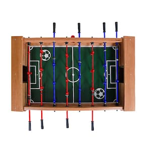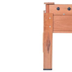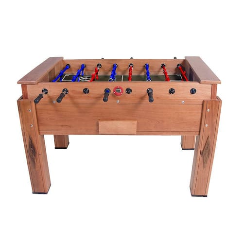 Mesa de pebolim nas medidas oficiais com estrutura em madeira maciça cedrinho em tom de mogno e com 04 pés, campo de jogo em 5mm de espessura na cor verde, bonecos em alumínio e ferros dos bonecos pintados em Epoxi.