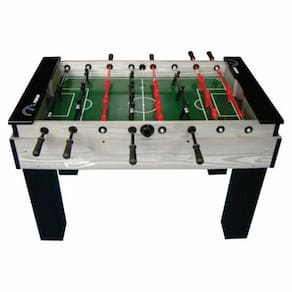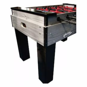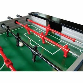 Mesa de pebolim nas medidas oficiais com estrutura da caixa produzida em madeira maciça pinus com pintura titanium metalizada, bonecos em alumínio fundido com pintura epóxi nas cores vermelha e preto e varões embutidos, goleiro com giro de 360º, contador de pontos e pés em MDP com sapata em polipropileno que evita a umidade nos pés.
