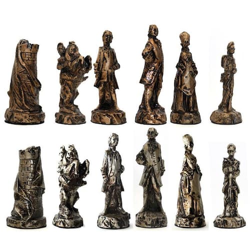 Com as 32 peças, 16 prata escura envelhecida e 16 dourado envelhecido, sem o tabuleiro.