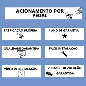 Características: Não necessita de outras conexões para instalação; Pressão de operação: vazão mínima de 7 l/min com 0,2kgf/cm e vazão máxima de 40 l/min com 8,0 kgf/cm; Pedal em aço inox (7cm de largura, 4mm de espessura e 10cm de altura); Diâmetro do cabo: 5mm; Vida útil: mais de 500.000 de acionamentos.