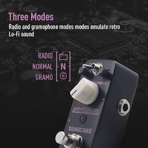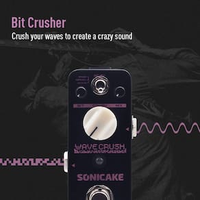 WAVE CRUSH é um redutor de taxa de amostragem e bit de três modos. Possui um downsampler digital que pode esmagar sua onda. Use-o para criar uma variedade de tons inovadores. Os modos de rádio e gramofone podem simular sons Lo-Fi vintage realistas. Especificações: Potência: CC 9 V 5,5 x 2,1 mm negativo central, 110 mA Dimensões: 93,5 mm (P) x 42 mm (L) x 52 mm (A ) Peso: 216 g - Bitcrusher Pedal compacto Bitcrusher/redutor de taxa de amostragem apresenta um Downsampler digital variável, flexível e de som doce - Formato de tom LoFi de 3 modos: simulador de rádio, modo normal e simulador de gramofone vintage no pedal de guitarra Bitcrusher - Taxa de amostragem: 750-44100Hz; Profundidade da broca: 5-16 bits para o pedal de efeitos de guitarra - O pedal True Bypass mantém um caminho de sinal limpo neste pedal Bitcrusher - Funciona com fonte de alimentação de pedal regular negativo central de 9 V (não incluída) no pedal da guitarra