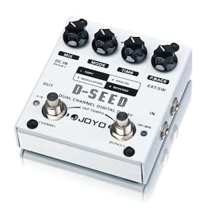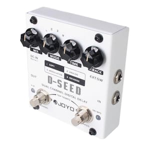 Feel JOYO, enjoy MusicPedais com preço incrível e padrão de pedais boutique.O Joyo D-SEED é um pedal de delay muito versátil, com função TAP-TEMPO embutida, podenso ser operada a qualquer momento independentemente da função delay utilizada.Possui dois canas presets : cada canal pode ser configurado e salvo independentemente, assim como todos os seus parâmetros, para que você possa usar difentes tipos de delay com agilidade e praticidade.Tempo máximo de delay de 6 segundos.Quatro tipos de delay: COPY: reproduz o som do instrumento sem nenhum efeito adicionalANALOG: Um delay quente como os vintage BBD delaysMODULATION: Um delay com modulação, caracterizado por ums profunda sensação de espaço, especialmente quando tocado com sons clean REVERSE: Um efeito muito interesante que inverte o som do delay criando um efeito bastante psicodélico17ms - 1000ms tempo de delayFunção TAP-TEMPO - até 6000 ms de delayDual channek desing com parêmetros salvos independentemente4 tipos de delay - COPY, ANALOG, MODULATION, REVERSEInput para acionamento a partir de dispositivos externosDescrição Técnica:Modelo D-SeedConsumo: 75mA Alimentação: 9v DC Dimensões: 10,2 x 5,0 x 10,5 cmPeso: 500 g