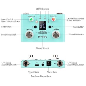 Pedal drum looper m-vave lost tempo Drum bateria : contém 30 tipos de bateria, suporte para personalização de bateria, edição de bateria e economia de bateria por aplicativo em tempo real. Contém tipos comuns de ritmo, 4/4, 3/4, 6/8, etc., que podem ser personalizados e editados. Suporte modo de bateria único. Os dois footswitches neste modo são como o botão de toque e o pedal de drum para obter um método de operação mais conveniente , para que você possa ser um baterista flexível. Looper: 4 loops podem ser armazenados, o tempo total de gravação é de até 11 minutos. O tempo de gravação de loop único é de até 5 minutos. Cada overdub ilimitado. Cada loop pode desfazer e refazer o áudio dos últimos overdubs tempos ilimitados. Suporte usando cabo usb para exportar/importar arquivos de áudio com formato wav padrão. Um pedal para controlar todas as funções de loop: gravar, reproduzir, parar, overdub, desfazer, refazer, excluído, etc. Tuner: é um afinador de alta precisão. É um pedal de efeito prático e fácil de usar Especificações: Material: liga de zinco Potência de entrada/saída: padrão 1/4 interface mono/ts Taxa de amostragem: 44.1k/24bit Capacidade de gravação total em loop: 11 minutos Capacidade de gravação de posição de loop único: 5 minutos Fonte de alimentação 1: adaptador do poder de dc9v - centro negativo não incluso Fonte de alimentação 2: usb 5v Corrente de trabalho: 90ma dc 9v , 125ma usb 5v Impedância de entrada: 1m ohm Impedância de saída: 100 ohm Tamanho do item: 100x64x18mm Peso do artigo: 176g Peso do pacote: 225g Tamanho do pacote: 11x8.5x3.5cm Lista de embalagem: 1 x pedal looper drum 1 x cabo tipo c 1 x manual inglês Marca: Não Informado
