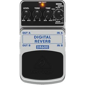 Marca: Behringer Modelo: DR600 Uso em Guitarras, Baixos e Teclados O regulador Level controla a intensidade sonora de saída. Tone pode alterar a sonoridade do conjunto de tons. Time ajusta o tempo de duração da ressonância. Com o regulador Mode, pode escolher entre 6 Reverbs diferentes: Spring: simula a reverberação clássica de mola. Plate: simula o som do reflexo em uma placa metálica. Hall: simula os reflexos de uma grande sala de concertos. Gate: este efeito corta artificialmente o som a partir de um determinado parâmetro. Room: simula a acústica natural de um quarto. Modulate: através de uma ligeira desafinação, é criado um som de espaço amplo que lembra um pouco efeito de coro. Dimensões : 11 x 6 x 5 cm Peso: 0,425 Kg : 6 Meses Ean: 4033653052092