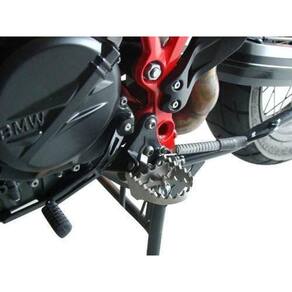 Através do sistema de fixação articulado, o qual permite o movimento de inclinação independente da pedaleira em relação à fixação na motocicleta, esta se mantem em contato com a bota do piloto durante todas as posições de pilotagem.