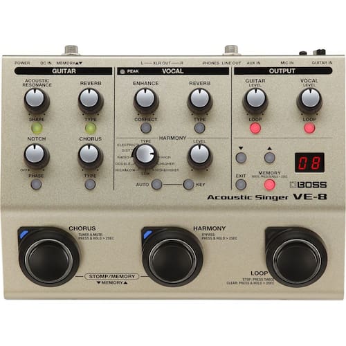 Solução completa para cantores que tocam violão Para cantores e compositores que tocam violão, o mundo está cheio de competitividade. O VE 8 Acoustic Singer oferece aquele toque extra que você precisa para se destacar e brilhar, ajudando com o som BOSS cada vez que se apresentar. Simples de usar, o VE 8 oferece alta qualidade de estúdio ao processamento de voz e violão, além de impressionantes harmonias e loops em tempo real, em uma unidade compacta e portátil. Com grande capacidade sonora e recursos poderosos e criativos, a casa vai cair toda vez que você se apresentar. Solução compacta com pré amp e efeitos para auxiliar cantores que tocam violão Acione o rico e sofisticado processamento de som BOSS com controles simples e intuitivos Processamento vocal de alta qualidade que inclui quatro tipos de efeitos de ambiência, além de Enhance, Pitch correction cromático para afinação vocal em tempo real, e mais Cria harmonizações vocais naturais em tempo real, baseadas no sinal do violão ou configuração manual Também inclui efeito de dobra de voz, além processamentos mais difíceis, como vozes eletrônicas meticulosamente afinadas, distorção e efeito de voz para rádio Canal dedicado para violão inclui Acoustic Resonance, reverb, chorus, afinador e vários efeitos, além de inversor de fase e notch filter para controle feedback Função looper com 80 segundos de gravação e capacidade para loop independente de violão e voz Modo de memória para armazenar e carregar 50 configurações favoritas Conectividade flexível para integrar com um PA principal e monitores de palco, além de USB para gravação no computador Alimentado com seis pilhas AA ou adaptador AC incluso Nível de Entrada Nominal MIC IN menos 40 dBu MIC Sens Center Guitar IN menos 10 dBu AUX IN menos 20 dBu Impedância de Entrada MIC IN 4 k ohms Guitar IN 20 M ohms AUX IN 18 k ohms Nível de Entrada Nominal LINE Out L barra MONO, R menos 10 dBu XLR Out L, R menos 10 dBu Vocal e Guitar, Guitar, menos 40 dBu Vocal Impedância de Saída LINE Out L Mono, R 1 k ohm XLR Out L, R 600 ohms Phones 44 ohms Modo Manual Memory Memory change e stomp Número de Memórias 50 Efeitos Parte vocal Enhance Pitch Correct Harmony barra FX High, Higher, High e Higher, Low, High e Low, Double, Radio, Dist, Eletric Reverb 3 Band EQ, Low Cut Parte Violão Acoustic Resonance Chorus barra FX Chorus, Tremolo, Phaser, Delay, Mod Delay, Octave, Slow Gear, Ring Mod Reverb 3 Band EQ, Low Cut Notch Filter, Phase Phrase Loop 80 seg Tela 7 segmentos, 2 dígitos LED Conectores Conector MIC IN tipo XLR, balanceado, power DC 48 V, 10 mA Max Jack Guitar IN tipo fone de 1 barra 4 polegada Jack AUX IN miniestéreo tipo fone Conectores XLR Out L, R tipo XLR Jacks LINE Oout L barra MONO, R tipo fone 1 barra 4 polegada Jack Phones miniestéreo tipo fone Jack Memory INC barra DEC em TRS tipo fone de 1 barra 4 polegada Porta USB COomputer USB tipo B Jack DC IN Alimentação Adaptador AC Bateria alcalina AA, LR6 x 6 Corrente 360 mA Expectativa de vida das baterias sob uso contínuo Bateria alcalina Aprox. 4.5 horas power OFF, Aprox. 2.5 horas power ON Estes valores podem variar conforme as condições reais de uso. Acessórios Manual do proprietário Folheto Uso seguro da unidade Adaptador AC