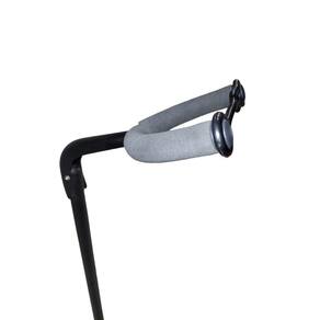 O suporte apresenta uma trava de borracha que mantém o instrumento firmemente posicionado, proporcionando estabilidade e segurança. O acabamento em metal pintado de preto fosco confere um visual moderno e elegante ao pedestal.