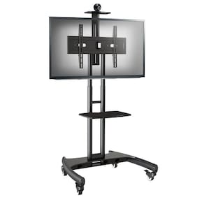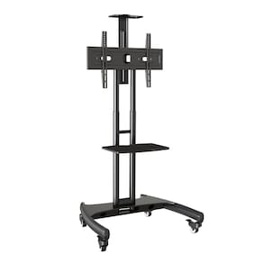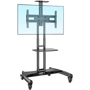 Pedestal Para Tv Com Rodízios Suporta 45Kg 32 A 75: ideal para movimentar sua TV de forma conveniente e fácil. Suporta TVs de até 75 polegadas, com peso de até 45kg e compatíveis com o padrão VESA. Possui rodízios com trava, ajuste de altura da TV, webcam e bandeja para notebook, passagem interna para fiação e regulagem de altura a cada 50mm. Fabricado em aço carbono, com tratamento anti-corrosão e pintura epóxi eletrostática. Capacidade máxima de carga sobre a bandeja inferior e superior é de 5kg cada. Garantia de 3 anos. Itens inclusos: 01 Pedestal para TV, manual de instruções, certificado de garantia e parafusos para fixação da TV/monitor. Ean: 6943223104992
