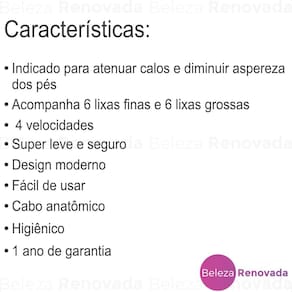 Pedicuro Profissional com 4 velocidades, cabo anatômico, design inovador, potente e leve. Acompanha lixas descartáveis, tornando-o higiênico e seguro. Seu design moderno permite melhor utilização em áreas sensíveis com segurança. Contém: Aparelho Pedicuro Compact, 4 Lixas Finas, 4 Lixas Grossas, Manual de Instruções, Guia de Assistência Técnica Autorizada e Certificado de Garantia.