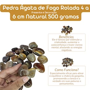 Pedra Ágata de Fogo Rolada Natural - 4 a 6 cm - 500 gramas A Pedra Ágata de Fogo Rolada é uma peça natural de alta qualidade, com tamanho de 4 a 6 cm e peso total de 500 gramas. Suas cores intensas e energias poderosas tornam essa pedra ideal para quem busca vitalidade, proteção e equilíbrio energético em sua vida. A Ágata de Fogo é amplamente conhecida por suas propriedades energéticas, ajudando a aumentar a energia física e emocional, proteger contra energias negativas e promover harmonia nos ambientes. Benefícios da Pedra Ágata de Fogo Rolada: