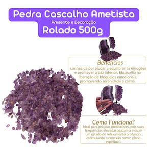 Pedra Cascalho Ametista Rolado 500g Natural pedra Cascalho Ametista Rolado 500g - Natural e Energética Este pacote de Pedra Cascalho Ametista Rolado de 500g é uma excelente opção para quem busca não só beleza, mas também as poderosas propriedades energéticas da ametista. As pedras roladas, com sua forma suave e acabamento polido, são perfeitas para decoração, terapias energéticas ou para quem aprecia a beleza única das pedras naturais. Benefícios Energéticos da Ametista: Equilíbrio e Clareza Mental: A ametista é uma pedra conhecida por sua capacidade de trazer equilíbrio emocional e clareza mental. Ela ajuda a acalmar a mente, aliviando o e a ansiedade, e promovendo uma sensação de paz e tranquilidade. Proteção Espiritual: Considerada uma pedra de proteção, a ametista é ideal para afastar energias negativas e proteger o ambiente. É muito utilizada em práticas espirituais e meditação para elevar a vibração energética e promover uma conexão mais profunda consigo mesmo. Desenvolvimento Espiritual e Intuição: A ametista é também uma excelente pedra para quem deseja expandir sua consciência espiritual, estimulando a intuição, promovendo autoconhecimento e apoiando o crescimento espiritual. Peso e Quantidade: Este pacote contém 500g de pedras cascalho ametista rolada, oferecendo uma quantidade generosa para suas necessidades de decoração, terapia ou colecionamento. Se precisar de mais informações ou tiver qualquer dúvida, não hesite em nos enviar uma mensagem Estamos prontos para atender você com todo carinho e atenção