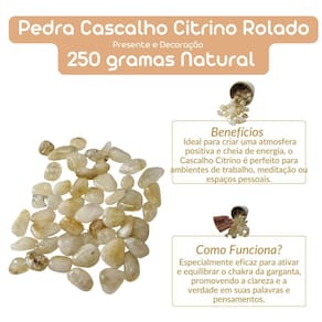 Pedra Citrino Rolado 1 a 2 cm 250 gramas Natural Pedra Citrino Rolado 250g Natural A pedra Citrino Rolado 250g Natural é ideal para atrair luz, prosperidade e energia positiva ao seu ambiente. Com suas cores douradas e amarelas, ela promove criatividade, autoconfiança e equilíbrio emocional, afastando energias negativas e trazendo abundância. Observações Importantes: Por ser natural, pode apresentar variações nas cores, tamanhos 1 a 2 cm , formatos e peso das pedras. O pacote pode conter também outros cristais ou Quartzos de qualidade , garantindo o peso de 250g Qualidade Garantida pedras polidas e selecionadas, perfeitas para colecionadores e entusiastas. Marca: Não Informado Ean: 7894135850271
