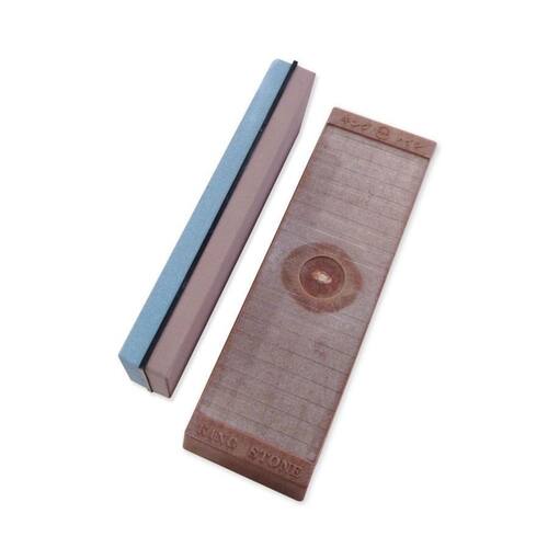 Pedra combinada KG-65 King - 220/granulo grosso e 1000/granulo médio. Fabricadas no Japão, as pedras king são reconhecidas mundialmente pela alta qualidade, rendimento e durabilidade para afiação e polimento de láminas. São produtos que atendem os mais exigentes profissionais quando o assunto é afiação e polimento de facas e ferramentas em aço de qualidade. Com as pedras king você corrige e recupera o fio de suas facas e ferramentas, desgastando o minimo de aço. Marcas que investem em qualidade de aço como Tojiro, Global, Iwood, Okatsune entre outros, recomendam King para manutençâo de seus produtos. A King oferece uma sequencia de pedras que atendem aos diferentes estágios no processo de afiação e polimento: Pedras de númeração de 80 à 400 são formadas com um material de granulometria alta granulo grosso , usadas no etágio de reparação e correção das lâminas. As de númeração de 700 à 1200 com uma granulométria média granulo médio , são usadas na afiação propriamente dita, neste estágio se difine a nitidez do fio. Por fim as de númeração 3000 à 8000 granulométria baixa granulo fino , para acabamento, correção de minisculas fraturas do fio e polimento. Modo de uso: Mergulhe a pedra em água limpa por cerca de 3 minutos, não é necessario mergulhar em água as láminas que deseja de afiar, e utiliza-lá para realizar a afiação. Para realizar o acabamento de sua lámina basta afiar levemente a parte de trás da mesma, de 2-3 vezes para remover a rebarba. Importante: Facas de dois gumes é necessario afiar o mesmo número de vezes os dois lados. Também caso seja realizado o processo de afiação com diversas facas é necessario mergulhar a pedra em água a cada afiação para remover as particulas deixadas na pedra. Para aficar facas em geral, facas de aço inoxidável, facas marteladas. Caracteristicas: Afiador Combinado KG-65 Dimensões Pedra : 185mmX63mmX25mm Dimensões Pedra com caixa : 230mmX80mmX50mm Matérial: Cerâmica Peso: 690g Grid: 220 granulo grosso Azul / 1000 granulo médio Marrom Fabricante: King Origem: Japão Ean: 4963188104327