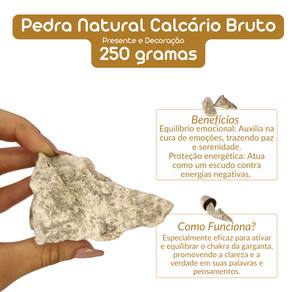 Pedra Natural Calcário Bruto – 500g O Calcário é uma rocha sedimentar amplamente valorizada por suas diversas aplicações e propriedades naturais. Em sua forma bruta, é ideal para colecionadores, estudos geológicos, artesanato e usos industriais. Benefícios do Calcário\nEstabilidade e conexão com a natureza: Associado ao equilíbrio e fortalecimento energético.\nUso educativo e científico: Muito utilizado em pesquisas, estudos geológicos e acadêmicos.\nAplicação versátil: Pode ser empregado na jardinagem, artesanato, decorações rústicas e processos industriais.\nObservações Importantes\nPor ser uma pedra natural, pode apresentar variações em cor, formato e textura.\nO peso aproximado da peça é de 500g, respeitando suas características naturais.\nTodas as pedras são cuidadosamente selecionadas para garantir a melhor qualidade.\nQualidade Garantida As pedras são escolhidas especialmente para colecionadores e entusiastas de minerais. Enviamos a sua encomenda em até 24 horas após a confirmação do pagamento! Caso tenha alguma dúvida, nos envie uma mensagem e responderemos rapidamente para te ajudar da melhor forma possível. Marca: Meta Atacado
