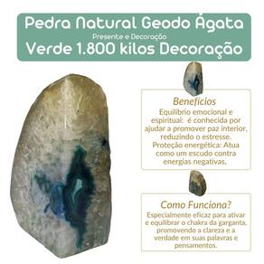 Pedra Natural Geodo Ágata Verde 1,8 Kg Decoração Pedra Natural Geodo Ágata Verde - 1,800 kg O Geodo de Ágata Verde é uma peça natural única, formada ao longo de milhares de anos. Seu interior cristalizado em tons vibrantes de verde proporciona um visual impressionante, sendo perfeito para decoração, energização de ambientes e práticas espirituais. Benefícios da Ágata Verde