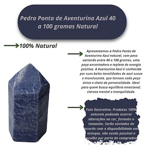 Pedra Ponta de Aventurina Azul 40 a 100 gramas Natural Apresentamos a Pedra Ponta de Aventurina Azul natural, com peso variando entre 40 a 100 gramas, uma peça encantadora e repleta de energia positiva. A Aventurina Azul é conhecida por suas belas tonalidades de azul suave e translucente, que tornam cada peça única e cheia de personalidade. Ideal para quem busca equilíbrio emocional, clareza mental e tranquilidade. Benefícios da Pedra Aventurina Azul: