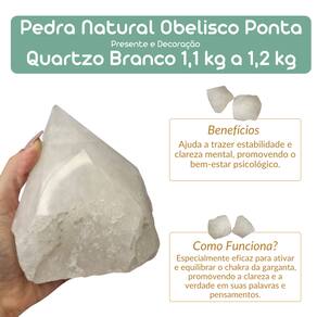 Pedra Natural Obelisco Ponta Quartzo Branco – 1,1 kg a 1,2 kg O Quartzo Branco é uma pedra natural conhecida por sua energia purificadora e capacidade de amplificação de vibrações positivas. Em formato de obelisco com ponta polida, é ideal para harmonização de ambientes, práticas esotéricas e colecionadores de cristais. Benefícios do Quartzo Branco
