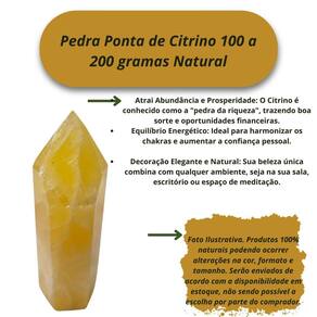 A Pedra Ponta de Citrino 100 a 200 gramas Natural é uma peça única e poderosa, conhecida por suas propriedades energéticas e estéticas. Esta pedra natural possui um brilho radiante e vibrante, ideal para quem busca atrair prosperidade, abundância e equilíbrio energético.