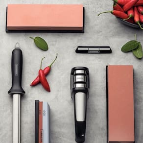 Não comprometa a qualidade das suas receitas e a beleza dos seus pratos por causa de uma faca sem fio. Com a Pedra para Afiar Tramontina Profio com Granulação 400 e 1000 Dupla Face com Suporte Emborrachado ficará ainda mais fácil de garantir aquele corte preciso. A linha Profio foi pensada especialmente na rotina de quem ama estar na cozinha. Para garantir a afiação, a pedra é produzida com grãos mistos para duas opções de afiação: desbaste 400 e acabamento 1000. Como segurança é assunto sério, conta com suporte antideslizante para tornar o processo ainda mais prático e confortável.
