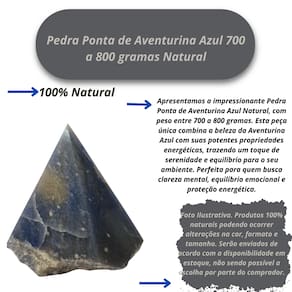 Apresentamos a impressionante Pedra Ponta de Aventurina Azul Natural, com peso entre 700 a 800 gramas. Esta peça única combina a beleza da Aventurina Azul com suas potentes propriedades energéticas, trazendo um toque de serenidade e equilíbrio para o seu ambiente. Perfeita para quem busca clareza mental, equilíbrio emocional e proteção energética. Benefícios da Pedra Ponta de Aventurina Azul: