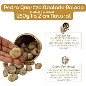 Observações Importantes: Por ser uma pedra natural, o Quartzo Opalado pode apresentar variações nas cores, tamanhos, formatos e peso das pedras. No entanto, garantimos que todas as pedras são cuidadosamente selecionadas por nossos especialistas para oferecer a melhor qualidade e pureza possíveis. Tamanho Aproximado: As pedras incluídas no pacote possuem tamanhos variando entre 1 a 2 cm. Para garantir o peso de 250g, o pacote será composto predominantemente por pedras de Quartzo Leitoso de excelente qualidade, podendo conter também pedras de outros tipos de Quartzo ou cristais de qualidade similar, assegurando o peso anunciado. Qualidade Garantida: As pedras são polidas e selecionadas especialmente para colecionadores e entusiastas de cristais.