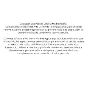 Esfoliante Peeling De Laranja Vita Derm 200G Possui Forte Abrasão E Ação Adstringente, Conferida Pelo Óleo Essencial De Laranja. Limpa Profundamente E Remove As Células Mortas, Favorecendo A Dos Ativos Específicos, Para Ser Utilizado Nos Tratamentos Estéticos. Produto Hipoalergênico Não Testado Em Animais. Marca: Não Informado
