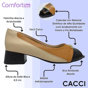 Este sapato peep toe feminino da Comfortflex combina sofisticação com conforto em cada detalhe. Seu cabedal foi desenvolvido com material de alta qualidade e acabamento brilhoso, complementado por detalhe metalizado na parte frontal que valoriza ainda mais o visual. O design com abertura frontal oferece leveza ao caminhar e um toque delicado ao modelo.