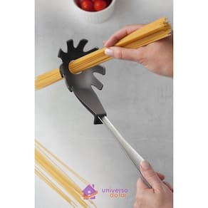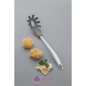 Pegador para massa de nylon, que resiste até uma temperatura de 180 C. Cabo de aço inox com furo passante possibilitando que seja pendurado na sua cozinha. Utensílio ideal para uso em panelas com revestimentos antiaderentes e cerâmicos, pois não danifica o produto. Pode ir à máquina de lavar louças facilitando seu dia a dia.