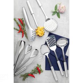 Cada alimento precisa do tipo certo de utensílio na hora de prepará-lo ou serví-lo. Com o Pegador Multiuso Tramontina Utility você tem muito mais praticidade na hora das refeições, já que ele pode ser utilizado de modo bastante versátil. Por ser totalmente em aço inox, não solta resíduos mantendo suas refeições muito mais saudáveis, seu acabamento em brilho deixará sua mesa ainda mais charmosa e pode ser levado à máquina de lavar louças sem ser danificado. É muita praticidade! Orientações Em aço inoxidável, altamente durável, mantém as características originais, preservando a beleza, a higiene e a durabilidade do material. Acabamento em brilho. Pode ser lavado, diariamente, na máquina de lavar louças. Características Gerais EAN13 7891116103715 DUN14 17891116103712 NCM 8215.99.10 Peso Líquido 0,1140 kg. Peso Bruto 0,1140 kg. Metragem 0,001008 m³. Dimensões Embalagem (Compr. X Larg. X Alt.) 280x 60x 60 mm. Dimensões Produto (Compr. X Larg. X Alt.) 280x 60x 60 mm. Espessura 0,8 mm. Observações Use apenas sabão ou detergente e uma esponja macia. Outros tipos de produto como palha de aço, poderão riscar ou prejudicar o brilho das peças. Enxágue cada item a fim de remover totalmente os resíduos dos produtos de limpeza, que, por serem abrasivos, podem danificar o inox. Sempre que possível, use água quente, pois renova o brilho das peças. Após a lavagem, enxugue imediatamente as peças, caso contrário, as substâncias químicas da água (cloro) poderão causar manchas. Evite atrito entre as peças durante o processo de lavagem e no armazenamento, para mantê-las sem riscos. Evite o contato do produto com superfícies quentes, pois elas provocam a descoloração do material. Não guarde as peças em locais úmidos. A umidade também provoca manchas.