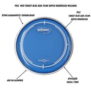 pele de filme duplo na cor azul 2 filmes com espessura de 7 mil cada possui óleo entre as peles, no formato de pele hidráulica ótima durabilidade com bastante punch e ataque bom controle de sobras semelhante a Remo Pinstripe Ebony e Evans Black Chrome acessíveis williams é uma marca brasileira de peles importadas pele acessível com bom custo x benefício