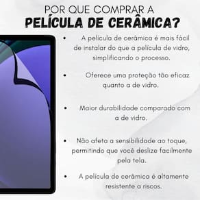 por que devo escolher uma película de cerâmica para o meu tablet R: a película de cerâmica oferece uma proteção avançada contra arranhões, mantendo a tela do seu tablet livre de danos e preservando sua clareza de imagem. como a película de cerâmica contribui para a longevidade do tablet R: graças à sua resistência avançada a arranhões e impactos leves, a película de cerâmica ajuda a proteger a tela do tablet, prolongando sua vida útil e evitando danos indesejados.