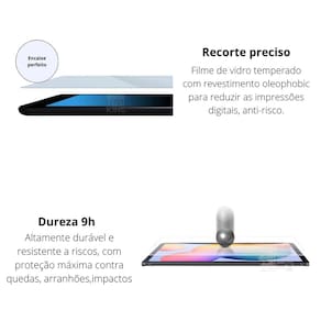 - não diminui a sensibilidade do touch da tela. - resistente à água, óleo, sujeira e poeira. - mantém o seu aparelho com toque suave e confortável. - máxima resistência 9h - vidro temperado genuino - máxima transparência - adere por eletrostática sem cola - fácil instalação após limpar a tela - protege contra riscos e impactos - recortes específicos compatível com o tablet - superfície oleofóbica - vidro 9h com 0,33mm de espessura