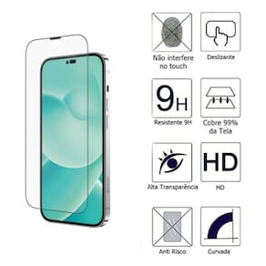 Cobre 100% da tela, anti estilhaço, resistente a riscos e marcas de dedos, não altera a sensibilidade do touch.Acabamento do material