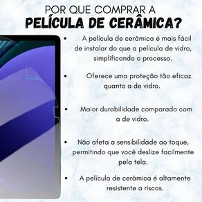 por que devo escolher uma película de cerâmica para o meu tablet R: a película de cerâmica oferece uma proteção avançada contra arranhões, mantendo a tela do seu tablet livre de danos e preservando sua clareza de imagem. como a película de cerâmica contribui para a longevidade do tablet R: graças à sua resistência avançada a arranhões e impactos leves, a película de cerâmica ajuda a proteger a tela do tablet, prolongando sua vida útil e evitando danos indesejados.