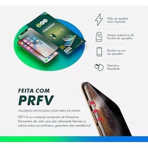 Fabricada em PRFV (Polímero Reforçado com Fibra de Vidro), material composto por finíssimos filamentos de vidro altamente flexíveis que proporcionam altíssima resistência. Bordas 2.5D que suavizam o toque e eliminam a sensação cortante. Alta resistência contra riscos e impactos com dureza 9H. Flexível e resistente, não se quebra com impactos. Cobertura ampla da frontal do aparelho.Tipo