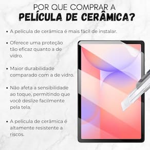Película protetora cerâmica para samsung s10 lite 10.9 x406 Cor: transparente Proteja a tela do seu tablet com a incrível película de cerâmica, a solução definitiva para manter seu dispositivo impecável. Já a versão fosca reduz o reflexo da luz, melhora a visibilidade e contribui para menor desgaste ocular, podendo ler muito mais tempo. ------------------ Atenção ------------------ Compatível com samsung s10 lite 10.9 polegadas x406 x400. Modo de uso: 1- limpe a tela do seu tablet, após esta limpa remova uma parte da película protetora e centralize a película de cerâmica no tablet. Com a ajuda de um cartão, sem fazer força deslize para firmar por todo comprimento. Caso apareçam bolhas, empurre novamente em direção às bordas do tablet. Caso tenha dificuldade você pode nos enviar mensagem no chat da compra Que iremos enviar um vídeo auxiliando na aplicação. ------------------ ------------------ A película de cerâmica afeta a sensibilidade ao toque R: não, a película é projetada para não interferir na sensibilidade ao toque dos dispositivos. Elas possuem uma camada ultrafina que mantém a capacidade de resposta da tela intacta, permitindo que você utilize o dispositivo normalmente sem problemas de perda de sensibilidade ao toque. Por que devo escolher uma película de cerâmica para o meu tablet R: a película de cerâmica oferece uma proteção avançada contra arranhões, mantendo a tela do seu tablet livre de danos e preservando sua clareza de imagem. Como a película de cerâmica contribui para a longevidade do tablet R: graças à sua resistência avançada a arranhões e impactos leves, a película de cerâmica ajuda a proteger a tela do tablet, prolongando sua vida útil e evitando danos indesejados. A película de cerâmica é compatível com o uso de canetas stylus Posso usar a capa com película A capa não levanta a película R: sim, é possível usar a capa com a película. A capa possui recortes precisos ao qual não se levanta a película. ------------------ Especificações ------------------ Material: cerâmica. Compatível com samsung s10 lite 10.9 polegadas x406 x400. ------------------ Conteúdo ------------------ 1x película cerâmica. 1x kit limpeza. Anúncio referente a película Tablet não incluso - qualidade garantida. - atendimento qualificado. - enviamos para todo o brasil. - compra garantida. - despachamos em até 1 dia útil após confirmação do pagamento Garantimos a devolução por arrependimento em até 7 dias, após o recebimento e de 15 dias contra defeitos de fabricação. Homologação Anatel: 101412208726