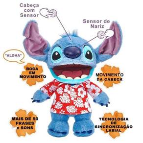 O alien mais fofo da galáxia chegou para animar suas brincadeiras! O Disney Stitch Havaiano Animatrônico combina marionetagem e robótica de forma inovadora, oferecendo uma experiência interativa única. Mais de 50 frases em Tantalog, a língua nativa do Stitch. Movimentos realistas: boca e cabeça se movem de forma sincronizada, 3 botões para mudar os humores (travesso ou rabugento) e ativar sons icônicos 30 cm de altura, ideal para abraçar e brincar. Feito com materiais super macios e ricos em detalhes, parece que saiu diretamente das telas para a sua casa! Recrie cenas dos filmes, invente histórias e desenvolva a imaginação com esse brinquedo incrível.