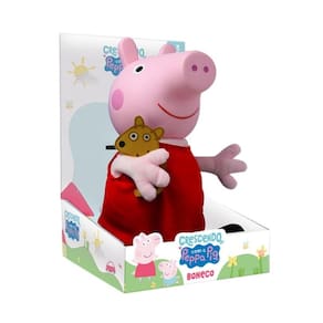 Peppa Pig é a porquinha mais amada pelas crianças, em versão boneca, corpinho e membros macios com enchimento em poliester, roupinha em tecido, cabeça em vinil, 32 cm de altura, acompanhada de seu brinquedo favorito Teddy (em tecido). A diversão garantida para as crianças!!