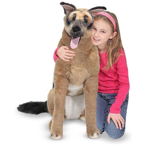 Este cachorro de pelúcia é um pastor alemão com a cabeça inclinada, feito de tecido macio e peludo com atenção aos detalhes. É construído resistente e possui uma estrutura interna que o mantém em pé. Não é destinado a ser utilizado como assento ou passeio.