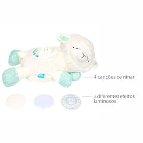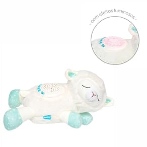 O Carneirinho da Buba vem com um dispositivo de efeitos luminosos e sonoros. Aperte os botões para ouvir canções de ninar e ligar o refletor que exibe imagens relaxantes como de um céu estrelado em plena parede do quarto! É a companhia perfeita para a hora do soninho