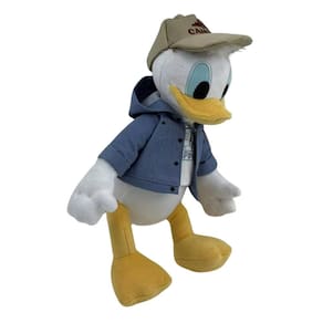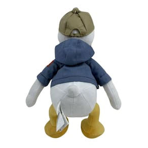 Donald vestido com boné, jaqueta e camiseta estampada: Um visual moderno e exclusivo que agrada a todos os fãs, tornando a pelúcia um item de destaque em qualquer coleção.