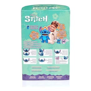 A pelúcia Chatty Stitch fala mais de 50 frases e sons em sua voz alienígena Tantalog, além de ter boca móvel, cabeça giratória, orelhas articuladas e sensores de toque na cabeça e no nariz. A tecnologia de sincronização labial permite que ele fale e se mova de maneira natural, tornando a brincadeira ainda mais envolvente.