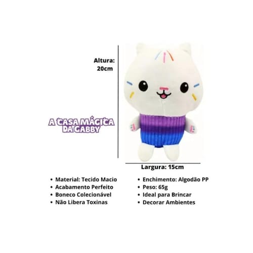 Com um design encantador e acabamento impecável, essa pelúcia é perfeita para colecionadores e amantes de itens fofos e divertidos.Se você procura por um presente especial ou apenas deseja adicionar um toque de doçura e aconchego ao seu lar, a Pelúcia Casa da Gaby é a escolha perfeita. Compre agora e comece a colecionar os mais diversos modelos da encantadora Casa Mágica da Gabby em pelúcia- Modelo: Pelúcia Cakey 20cm- Material: Tecido Macio com Enchimento em Algodão de polipropileno- Altura: 20cm- Largura: 15cm- Peso: 100g- Não Libera Toxinas- Resistente a quedas, não quebra se cair no chão- Produto Colecionável- Ideal para Todas as Idades- Produto perfeito para dormir abraçado