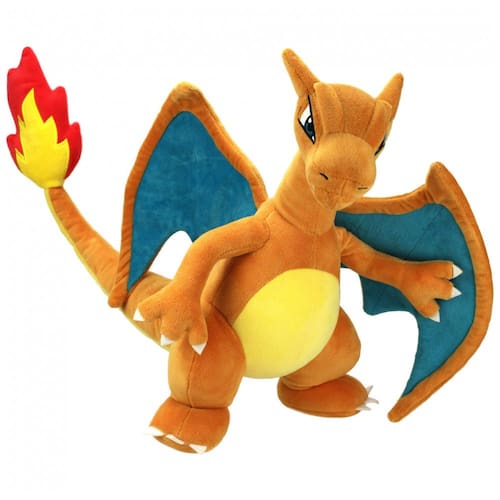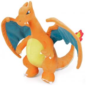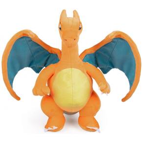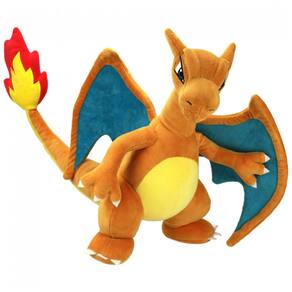 A pelúcia Pokémon Charizard de aproximadamente 30 cm é um boneco macio produzido em poliéster, que representa a evolução de Charmander em formato tridimensional para brincadeiras e decoração. O design reproduz as principais características do personagem, incluindo corpo laranja, asas, cauda com chama e expressão inspirada na série animada Pokémon.