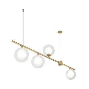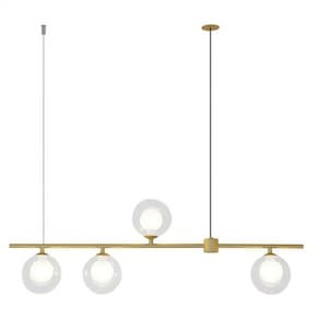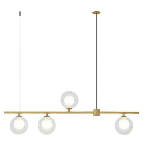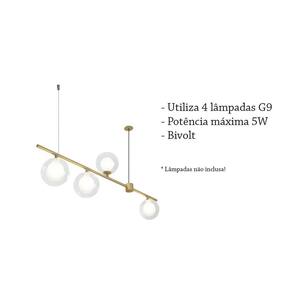 Pendente em metal dourado com 4 globos duplo de vidro transparente sendo o globo menor interno branco, assim a lâmpada não fica aparente. Proporciona uma iluminação bem distribuída por todo o espaço, garantindo comodidade e praticidade. É recomendando para ambientes como; cozinha, mesa, sala, sala de jantar. Produto , qualidade premium. Descrição: Comprimento: 90cm Largura: 11,5 cm Altura: 26 cm Globo : 11,5 cm Não acompanha lâmpada. Ean: 7891072774943