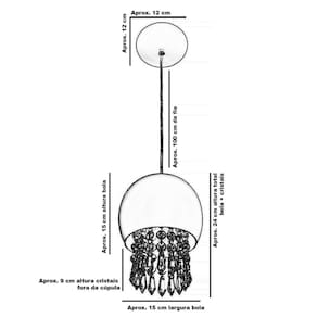 Dados Técnicos: -Alimentação: Bivolt -Tipo de lâmpada: 1 x E-27. (não inclusas) -Peso Aprox. com embalagem: 0,600kg -Dimensões aprox. do produto 15x14cm (bola) -1 Metro de Fio PP -Soquete de Porcelana -Canopla de Fixação de 12cm de diâmetro -112 Castanhas 14mm cristal acrilico - 16 pirulitos cristal acrílico